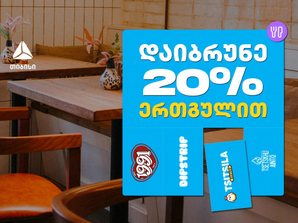 სწორედ ამიტომ, თიბისიმ მომხმარებელს კვლავ მათზე მორგებული შეთავაზება, ამჯერად, კვების ობიექტებში მოუმზადა.31 დეკემბრის ჩათვლით, გადაიხადე თიბისის ერთგული საკრედიტო ბარათით შერჩეულ ობიექტებში და მომენტალურად დაიბრუნე გადახდილი თანხის 20% - რაც მთავარია, ულიმიტოდ.20%-იანი ულიმიტო ქეშბექის დაბრუნებას ოთხ რესტორანში შეძლებთ, თანაც მომენტალურად:ცეცხლი აინთო - თბილისის ორ ფილიალში (აბაშიძის ქ. N10 და ტაშკენტის ქ. N10-ში) მწვადის მოყვარულები უგემრიელეს კახურ, კლასიკურ და ქათმის მწვადს, ასევე სხვა საინტერესო ქართულ კერძებს დააგემოვნებთ.წიწილა - ქათმისგან დამზადებული მრავალფეროვანი კერძების დაგემოვნებას “წიწილას” ორ ფილიალში: აღმაშენებლის გამზირი 110 და კოსტავას 76-ში - შეძლებთ. “წიწილა” გამორჩეული ადგილია მსუბუქი და ნოყიერი წახემსებისთვის.Cafe 1991 - თბილი ატმოსფერო, სენდვიჩებისა და დესერტების მრავალფეროვანი არჩევანი და სასმელი ნებისმიერი გემოვნების ადამიანისთვის - ა. შანიძის 11 ნომერში მოქმედი კაფე “1991” იდეალური ადგილია, დამღლელი სამუშაო დღის შემდეგ განსატვირთად.Dipstrip - კოსტავას 70-ში სწრაფი კვების მოყვარულებს პრემიუმ ქათმით და ფრეშ ინგრედიენტებით დამზადებული ბურგერების მენიუ დაგხვდებათ. თუ ჯანსაღი, მაგრამ აქტიური ცხოვრების წესით ცხოვრობთ, Dipstrip იდეალური არჩევანია სწრაფი ლანჩისთვის.ამიტომ, გადაიხადე თიბისის ერთგული საკრედიტო ბარათით იქ, სადაც ისედაც იხდი, და დაიბრუნე უფრო მეტი.ლიმიტის დამტკიცება და ბარათის აღება მობაილბანკიდან 1-2 წუთშია შესაძლებელი. მის ციფრულ საფულეში გადატანას და ლიმიტით სარგებლობას კი მომენტალურად შეძლებ.