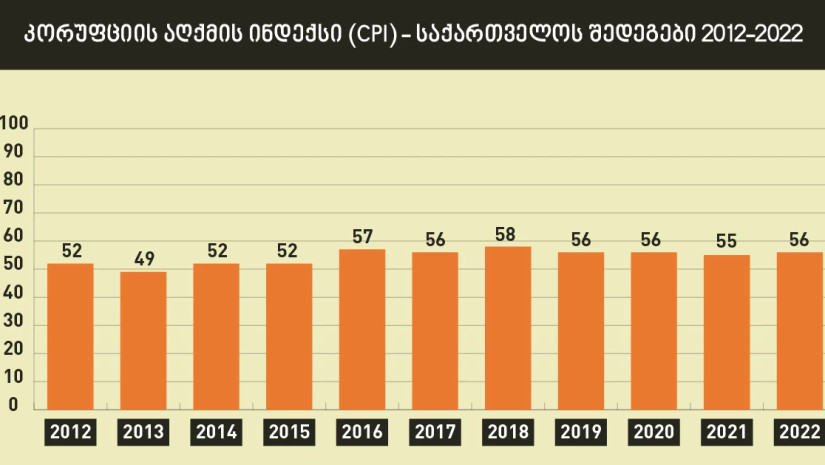 "საერთაშორისო გამჭვირვალობის“ მიერ გამოქვეყნებული 2022 წლის „კორუფციის აღქმის ინდექსის“ (CPI) მიხედვით, საქართველოს 56 ქულა აქვს, რაც წინა წელთან შედარებით ერთი ქულით მეტია. წარსულში 56 ქულა ქვეყანას სამჯერ – 2017, 2019 და 2020 წლებში  ჰქონდა.