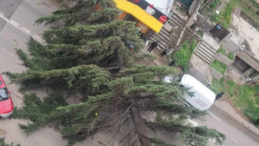 სურათში ჩანს, რომ ხე იქვე მდებარე საკვები ობიექტის შენობას დაეცა.